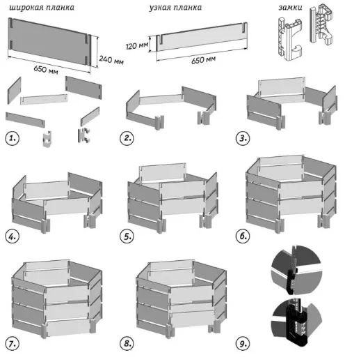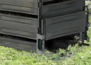 - Оригинальная конструкция позволяет доставать нижний слой перегноя не разбирая весь компостер. Достаточно снять нижнюю планку для того чтобы получить доступ к компосту.