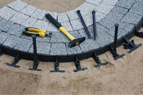 Прежде чем применять анкера, необходимо разложить бордюр, совершить надрезы для формирования необходимых изгибов, а уже потом зафиксировать данное искривление, вставив колышек под нужным углом в заводские отверстия. В роли рабочего инструмента лучше всего использовать молоток.