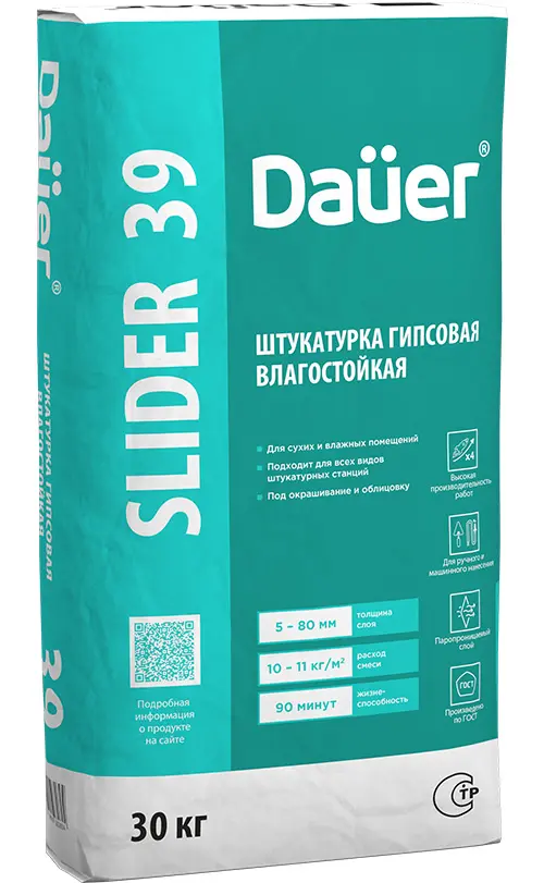 Slider Interier 39, 30 кг, Штукатурка гипсовая универсальная влагостойкая класс 90/2,0, ГОСТ Р 58279, Dauer, мешок